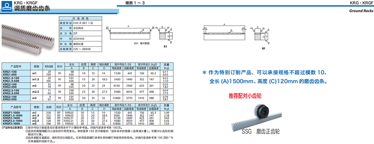 ② KRHG·KRHGF 齒磨齒斜齒齒條及 SRH 斜齒齒條的配對小齒輪有限制。另外 , 產(chǎn)品的輪齒旋向有右旋及左旋 ,請在選擇時注意旋向。