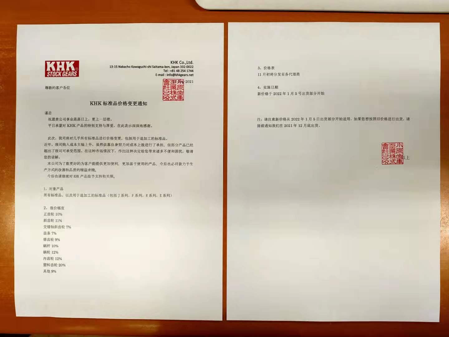 KHK標準品 價格 變更通知